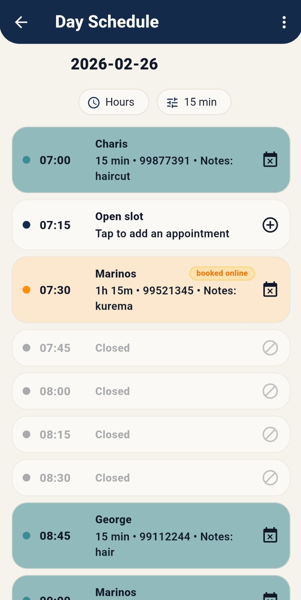 Define your working hours, break times, and appointment durations in a few taps.